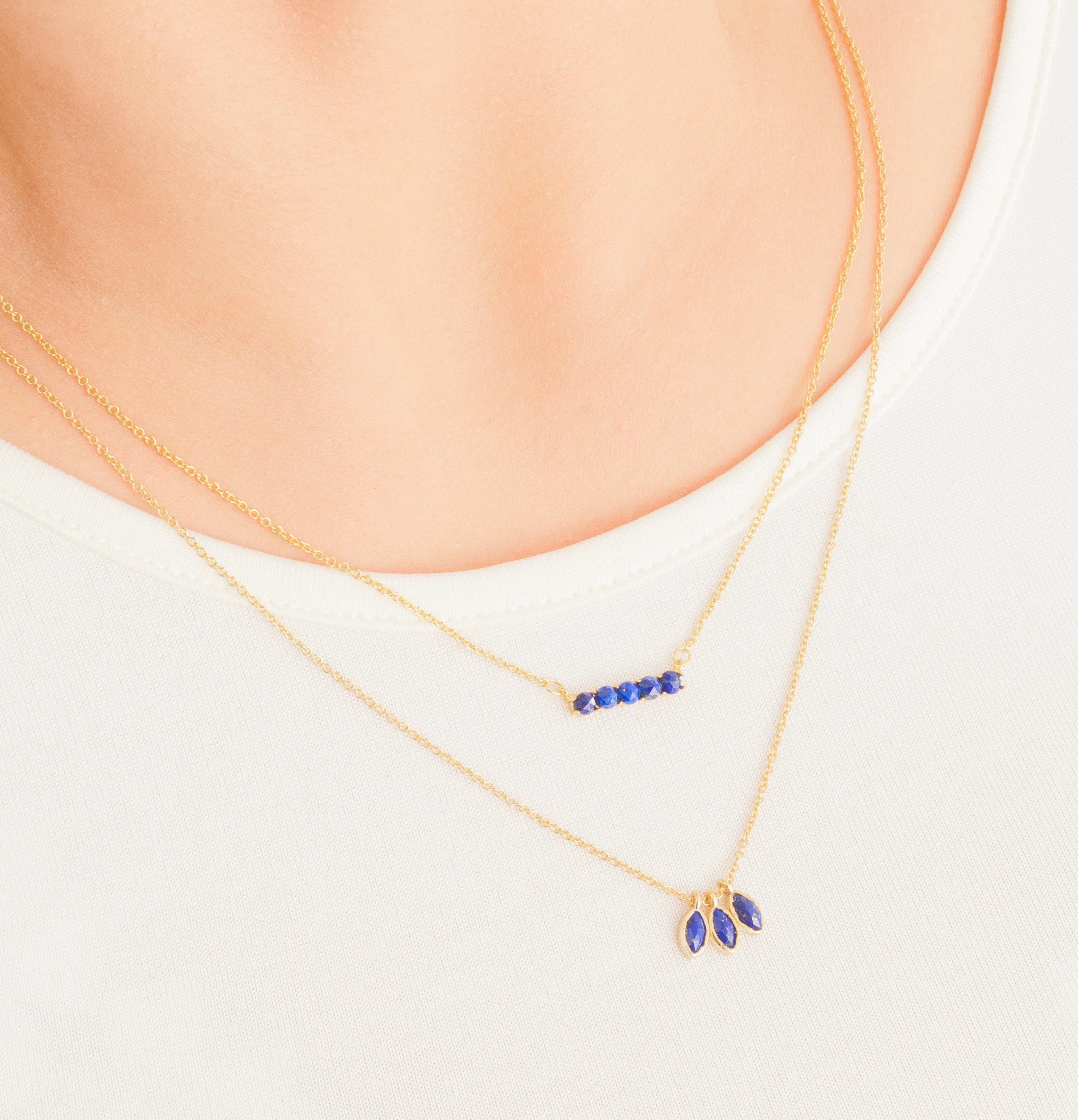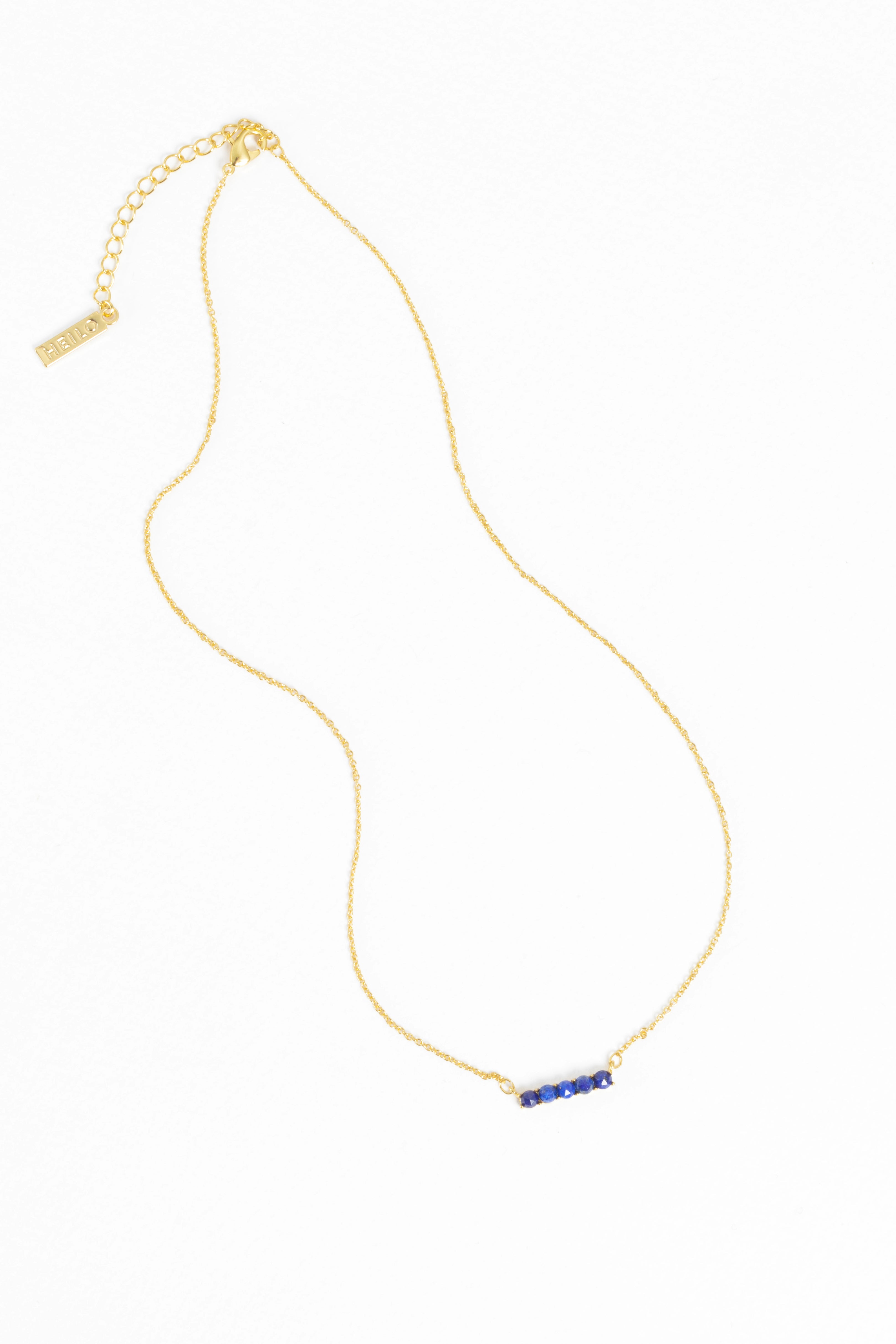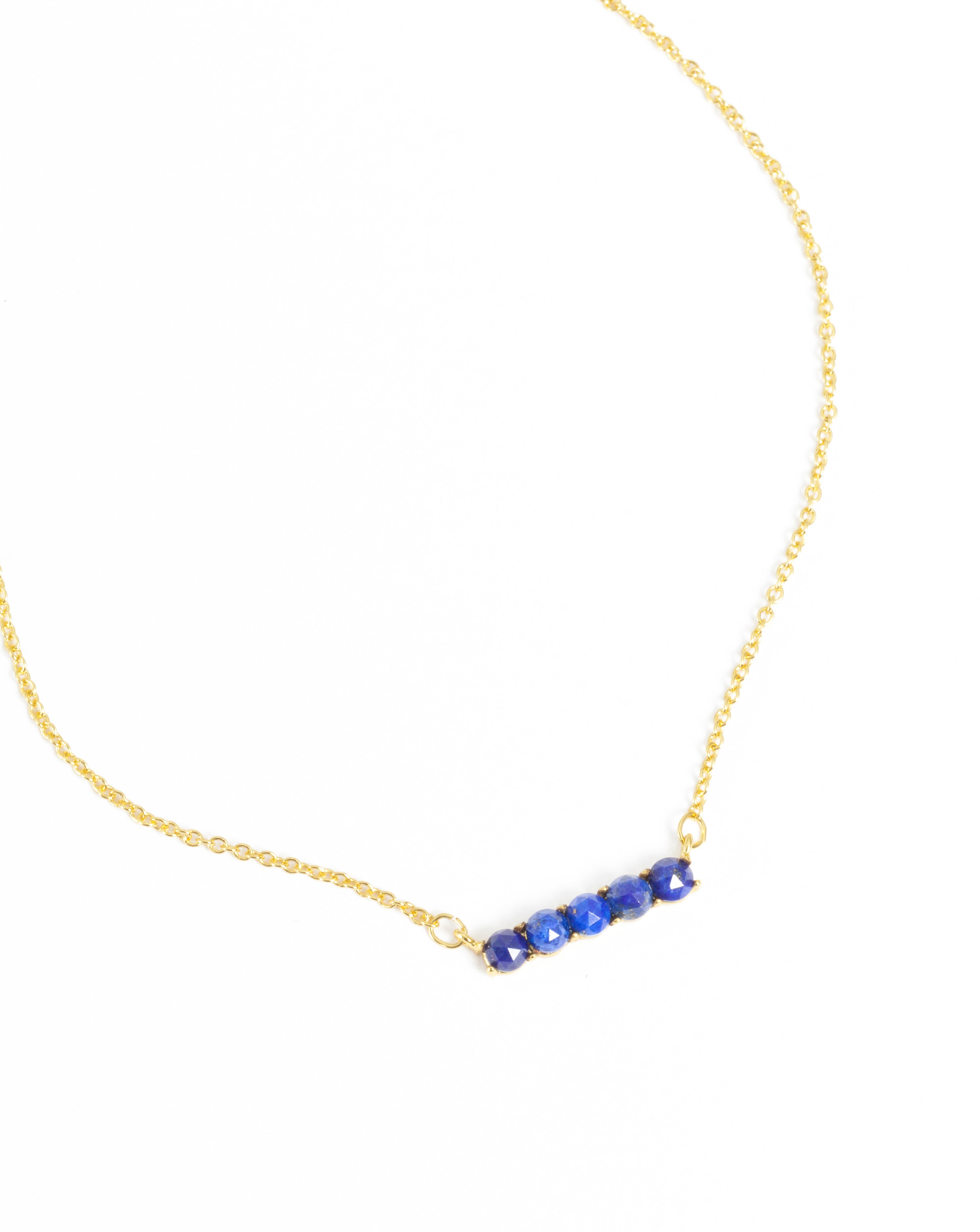 The Josie Necklace is the perfect everyday staple featuring a bar of five gemstones. Materials: Lapis, Gold plated with a brass base, 16" chain with a 2" extension