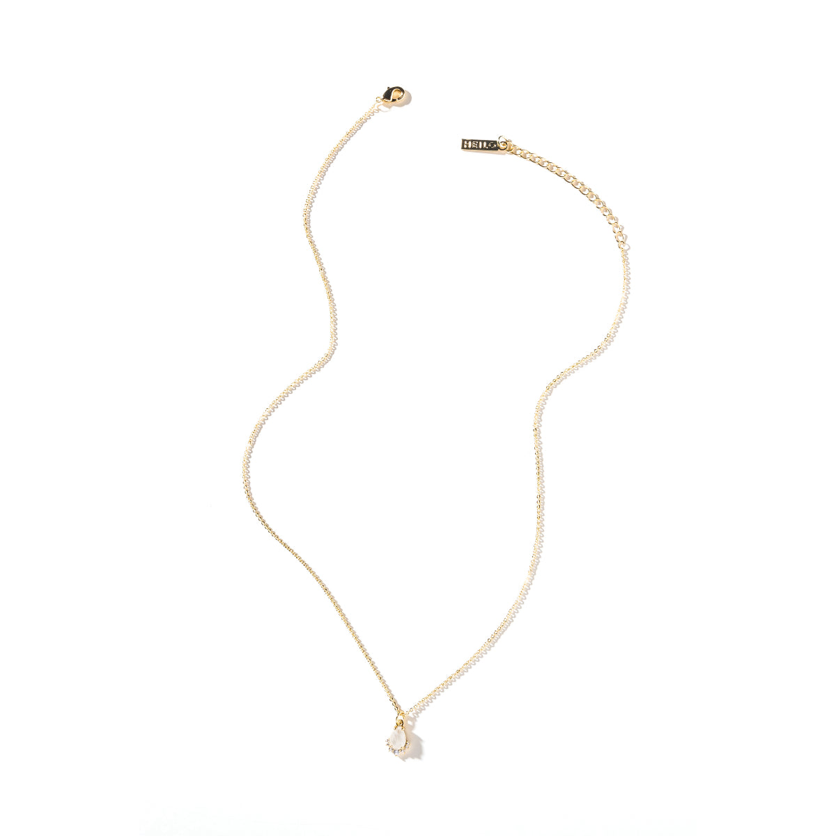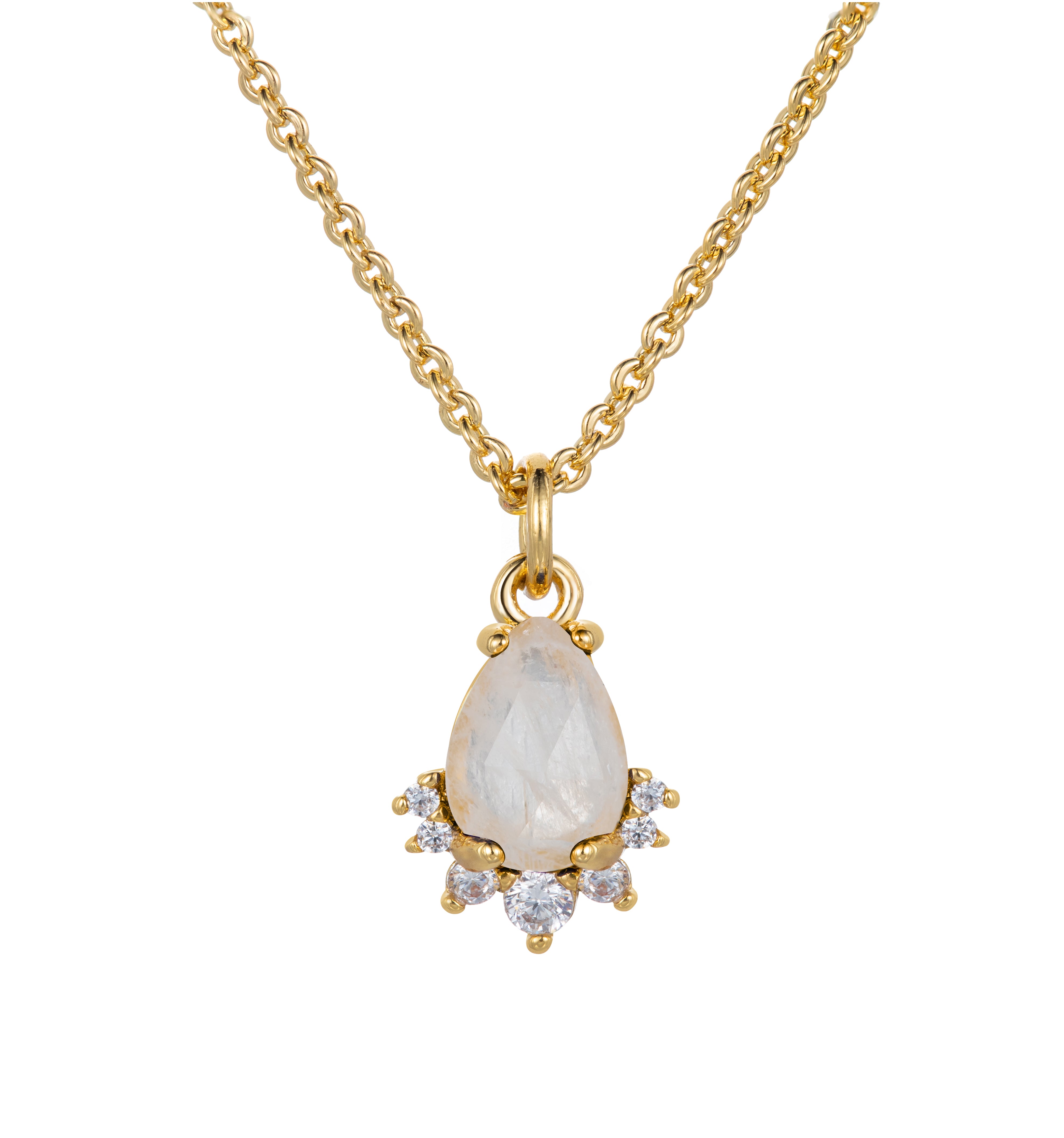 The Joy pendant necklace features a beautiful rose cut pear shaped stone accented with a sparkling arc of CZs. Materials: Moonstone, Cubic Zirconiam 14K Gold plating with a brass base, 16" chain + 2" extension